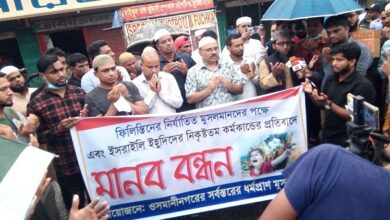 ফিলিস্তিনে ইসরাইলের হামলার প্রতিবাদে ওসমানীনগরে মানববন্ধন